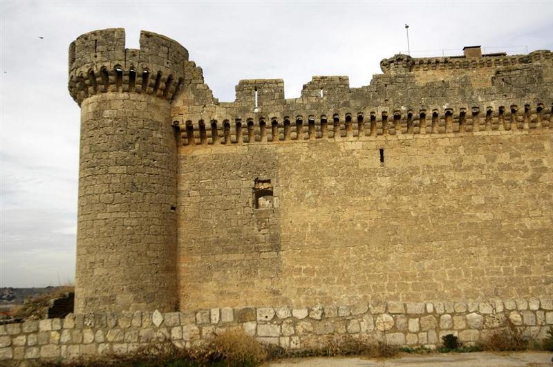 Posee barbacana y cubos angulares con matacanes y almenas semejante al de Fuensaldaña.