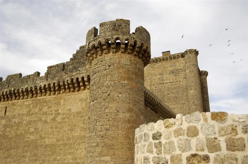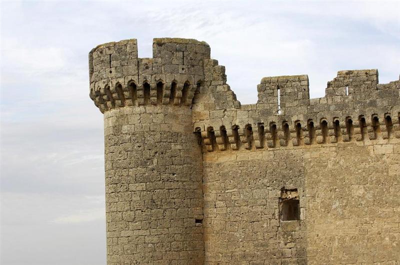 Posee barbacana y cubos angulares con matacanes y almenas semejante al de Fuensaldaña.